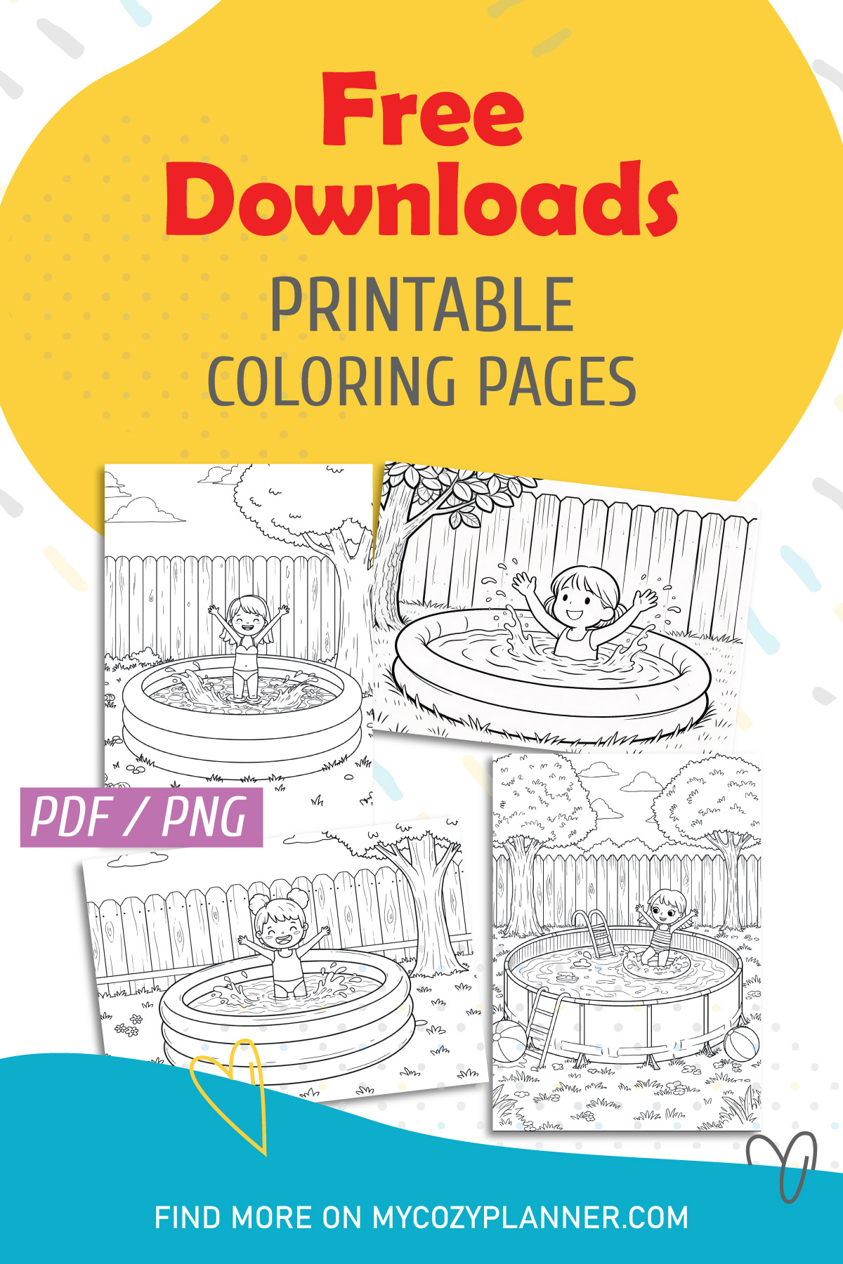 Dive into summer fun with this delightful set of 4 printable coloring pages featuring a girl enjoying the swimming pool.