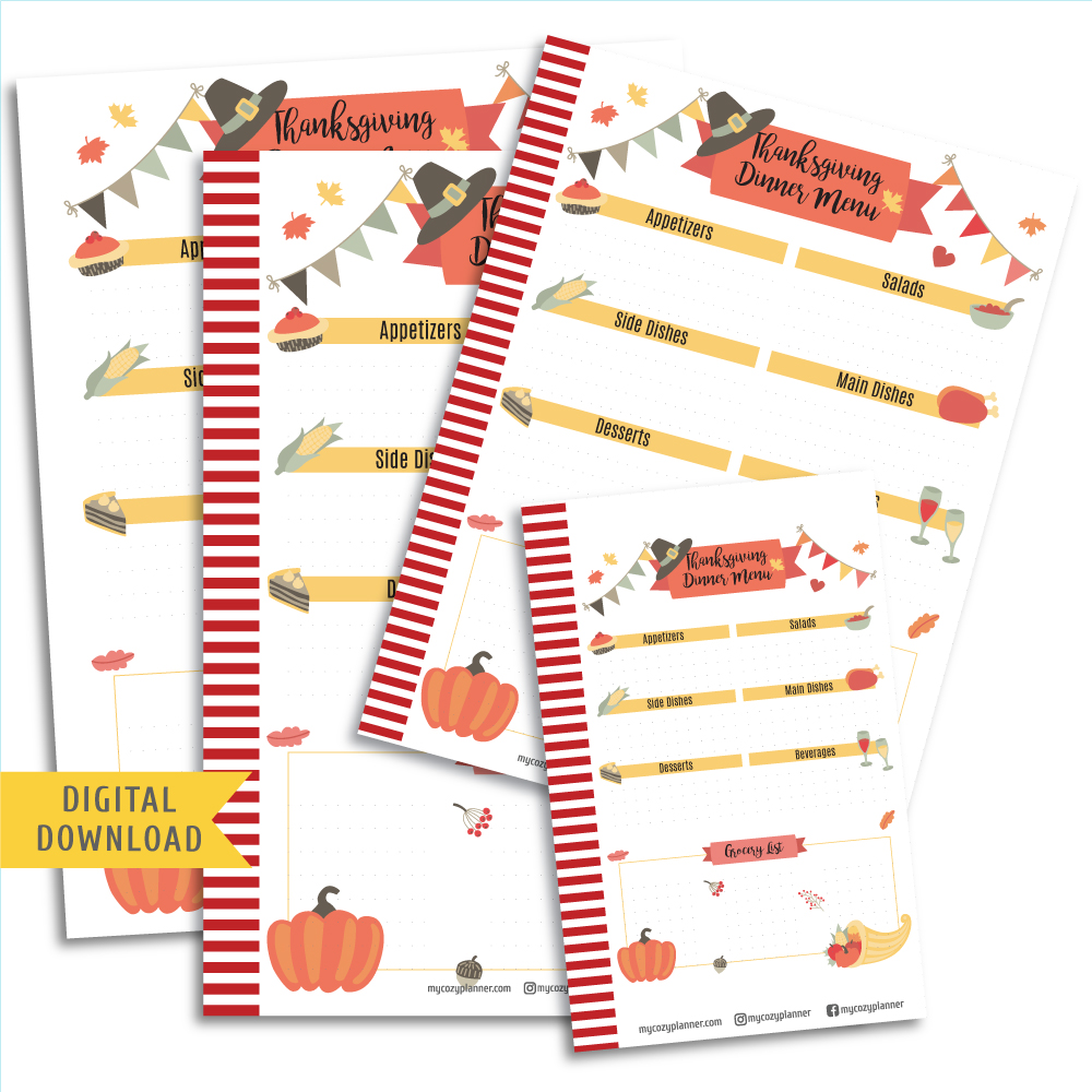 Do not miss anything in your Thanksgiving Dinner preparation! With this colorful menu it will be very easy for you to keep an eye on everything: your grocery list and dishes you are going to cook for Dinner.