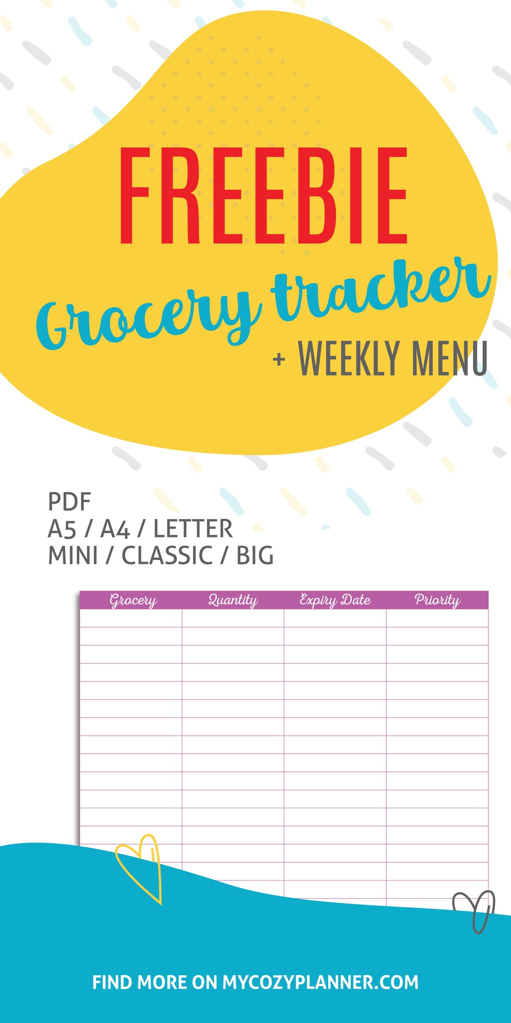 Make a list of your grocery with expiry dates and using priorities. After that plan your weekly menu accordingly these priorities.Grab your free grocery tracker andย weekly menu, print it out, place on the fridge with magnets or add to your The Happy Planner.