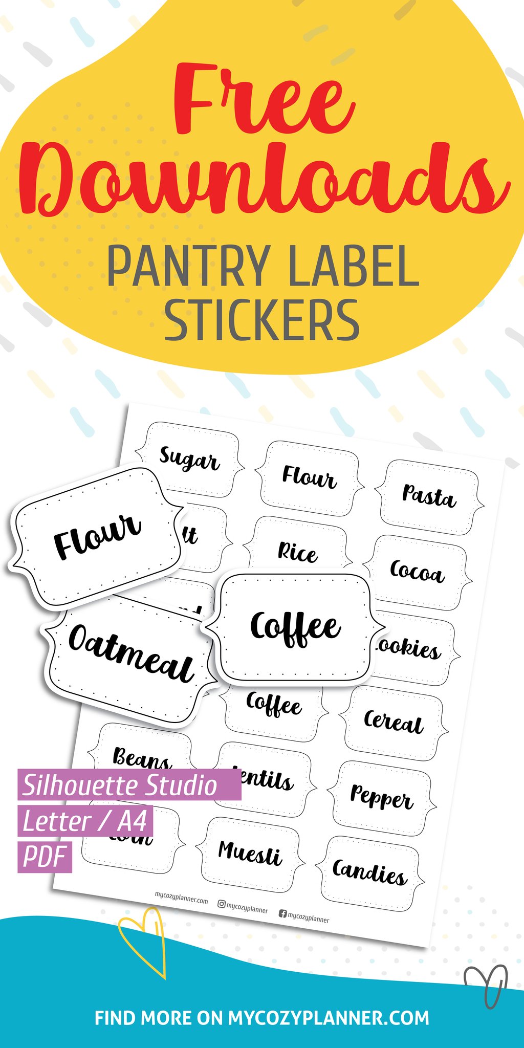 Do you want to make your pantry look more stylish? Grab your free Pantry Label Stickers, print it out, cut with cutting machine or scissors, and place on your storage containers.