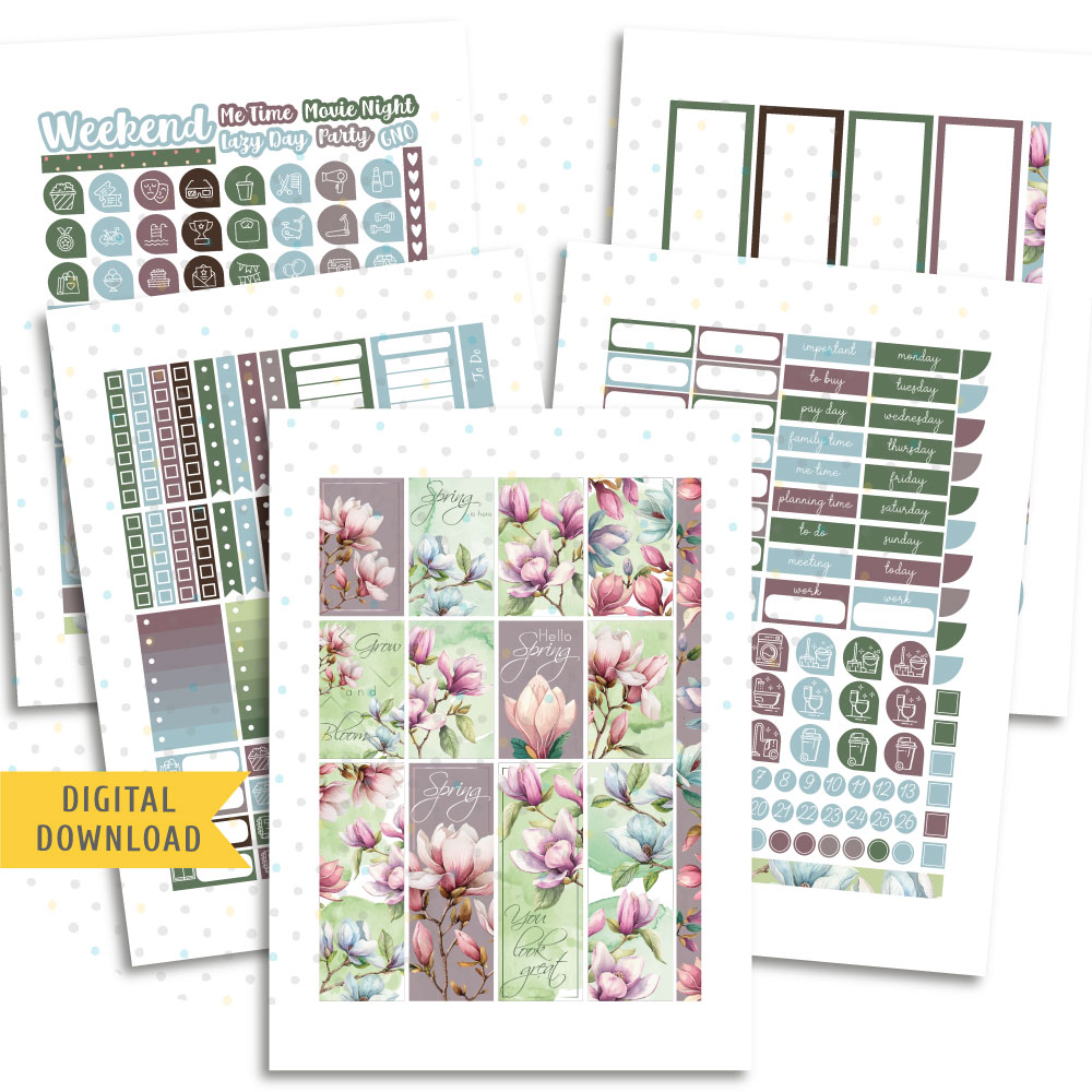 Spring Magnolia Sticker Kit. Printable Planner Stickers.