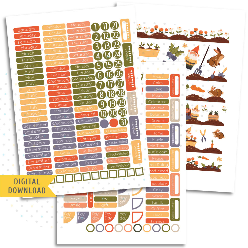 Printable The Love of Gardening Monthly Sticker Kit includes:
